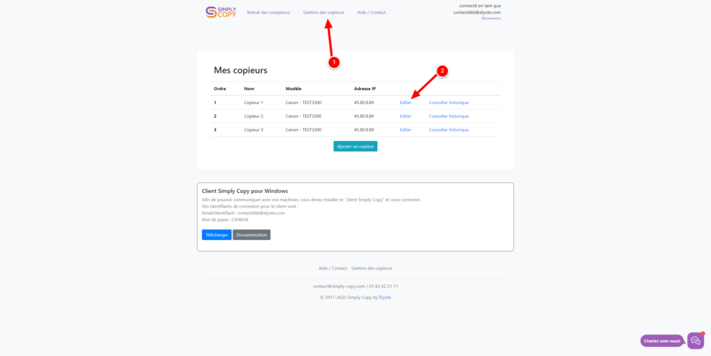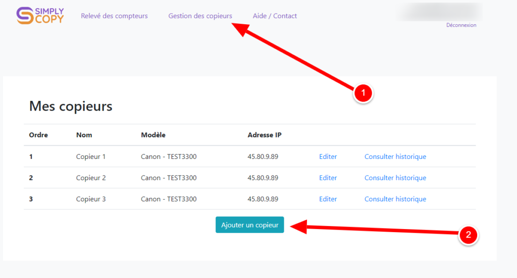 Pour valider l’enregistrement, vous devez cliquer sur « Ajouter » et le copieur apparaitra immédiatement dans votre compte, il faudra cependant actualiser la page de relevé si celle-ci est déjà ouverte afin de prendre en compte l’ajout du copieur.
