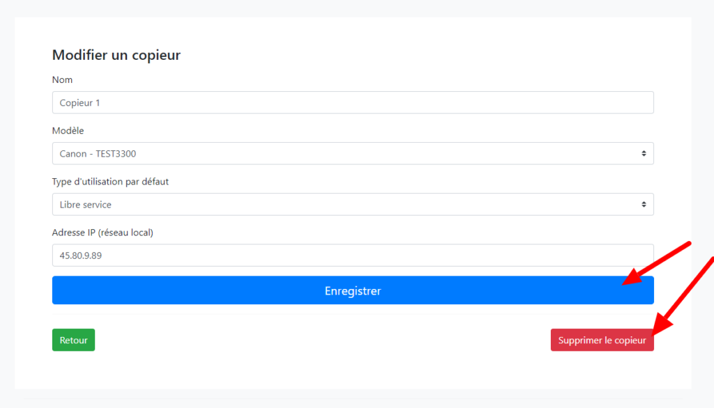 Vous pouvez alors modifier les informations d’un copieur ou le supprimer.