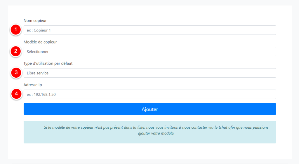 Pour pouvoir ajouter un nouveau copieur, vous devez vous rendre dans votre interface de gestion, dans le menu « Gestion des copieurs » puis cliquer sur « Ajouter ».