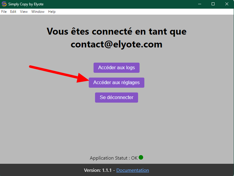 Un clic droit sur l’icone vous permettra de l’ouvrir et d’afficher la fenêtre dans laquelle vous pourrez voir l'état de la connexion à votre compte. - redémarrer le programme Simply Copy en réalisant un clic droit sur l’icone